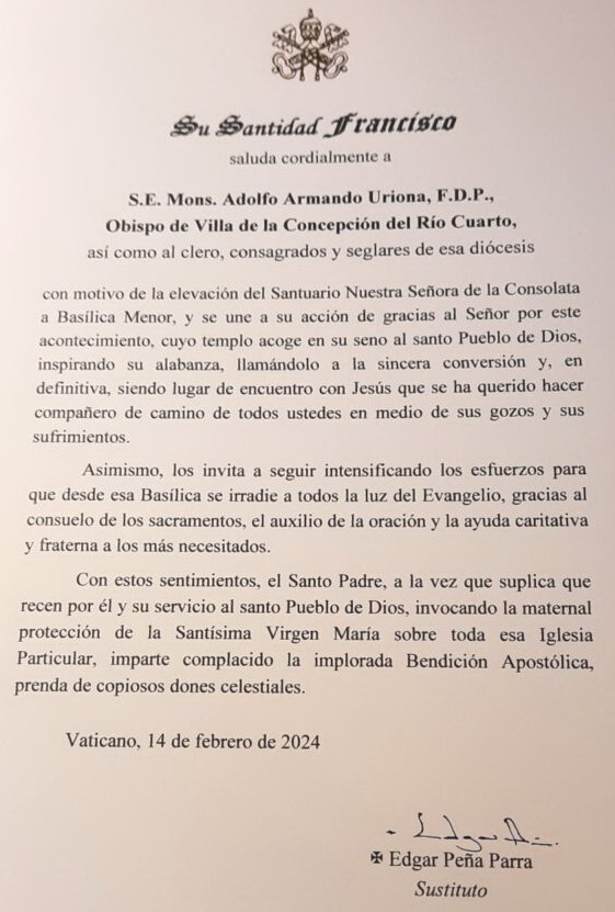 El Papa Francisco, a través de una carta con la firma del sustituto de la Secretaría de Estado de la Santa Sede, monseñor Edgar Peña Parra, envió un saludo para esta ocasión tan especial. El obispo local, monseñor Uriona, bendijo las placas recordatorias y el escudo basilical.